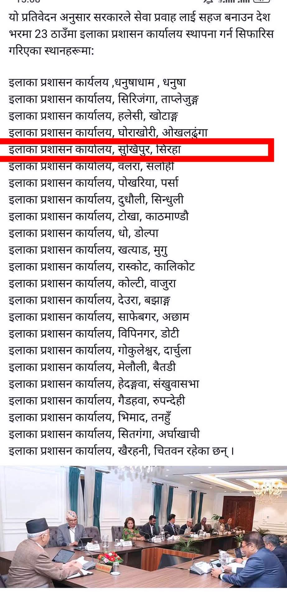 सुखीपुर ( सिरहा) / सरकारले देशभर २३ वटा नयाँ इलाका प्रशासन कार्यालय स्थापना गर्ने निर्णय गरेको छ । यस अन्तर्गत सिरहा जिल्लाको सुखीपुरमा पनि इलाका प्रशासन कार्यालय खोलिने भएको छ ।